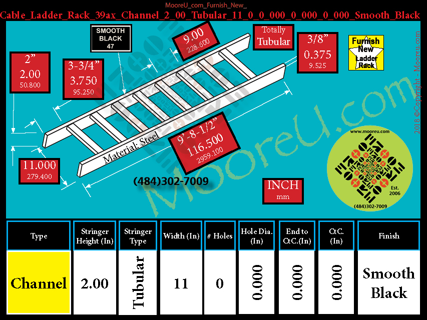 Cable Ladder Rack, 9'-8-1/2" stick, Color= Smooth_Black, Type = Channel, Stringer Construction = Tubular, Stringer Height = 2", Width = 11" ,Num of Holes = 0 ,Hole Dia = None ,End to CtC = None ,CtC = None