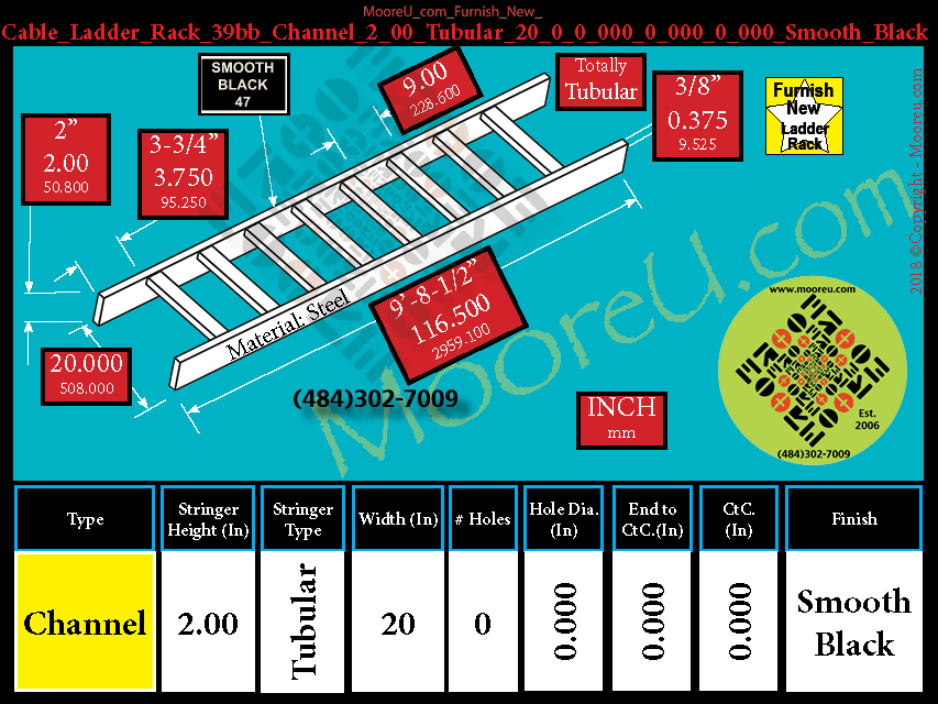 Cable Ladder Rack, 9'-8-1/2" stick, Color= Smooth_Black, Type = Channel, Stringer Construction = Tubular, Stringer Height = 2", Width = 20" ,Num of Holes = 0 ,Hole Dia = None ,End to CtC = None ,CtC = None