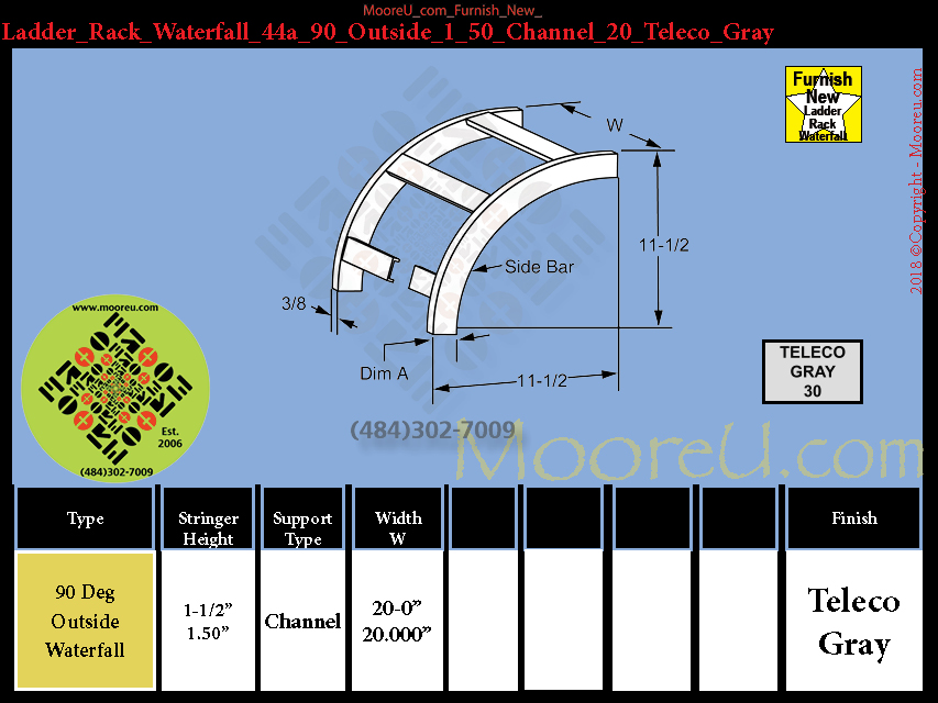 Ladder Rack Waterfall, Each, Color = Teleco_Gray, Degree = 90, Bend Type = Outside, Stringer Construction = Channel, Stringer Height inch = 1-1/2", Width inch = 20, Waterfall Depth In = 11_50, Waterfall Height In = 11_50