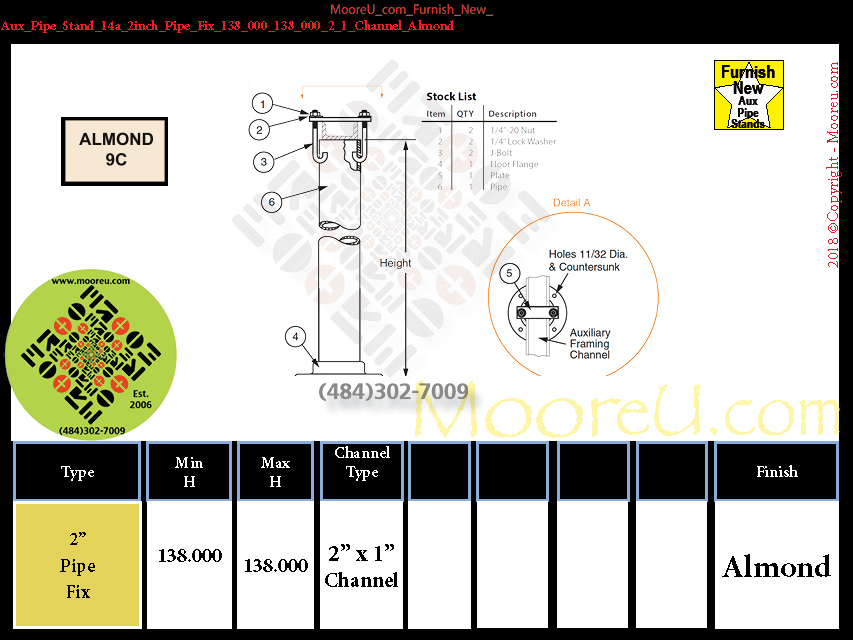 Aux Pipe Stand, Each_Kit, Color = Almond, Support = 2inch_Pipe, Type = Fix, Min Height = 96", Max Height = 138", Base Width = 6", Base Depth = 6", Number Base Bolt Hole(s) = 4, Base Bolt Size Dia = 11/32", Top Type = 2_1_Channel