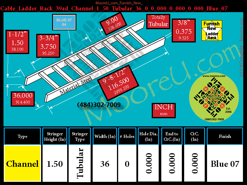 Cable Ladder Rack, 9'-8-1/2" stick, Color= Texture_Black, Type = Channel, Stringer Construction = Tubular, Stringer Height = 1-1/2", Width = 36" ,Num of Holes = 0 ,Hole Dia = None ,End to CtC = None ,CtC = None