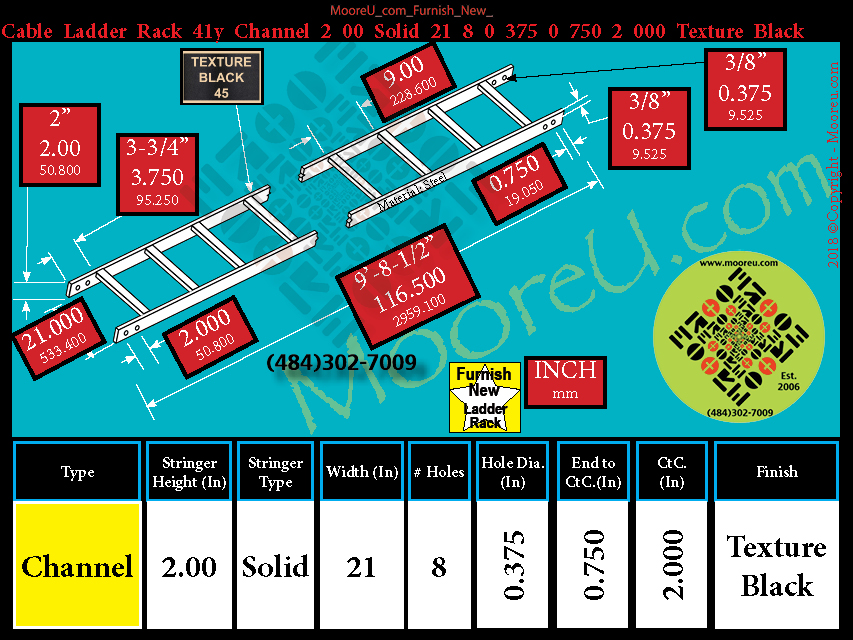 Cable Ladder Rack, 9'-8-1/2" stick, Color= Texture_Black, Type = Channel, Stringer Construction = Solid, Stringer Height = 2", Width = 21" ,Num of Holes = 8 ,Hole Dia = 3/8" ,End to CtC = 3/4" ,CtC = 2"