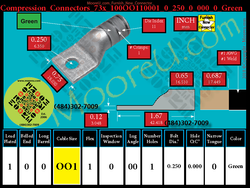 Each, Color: Green, Lead Plate: Yes, Belled: No, Barrel: Std., Conductor: 225/24 175/24- #1 Weld #1 AWG, Flex: Yes, Inspect Window: No, Angle: OO, Num Holes: 1, Bolt Size Dia: 1/4", C To C: 0, Tongue: Std, Tongue Wide: 0.75, Barrel L: 0.65, Thick: 0.12, Length: 1.67, mm x mm= n/a