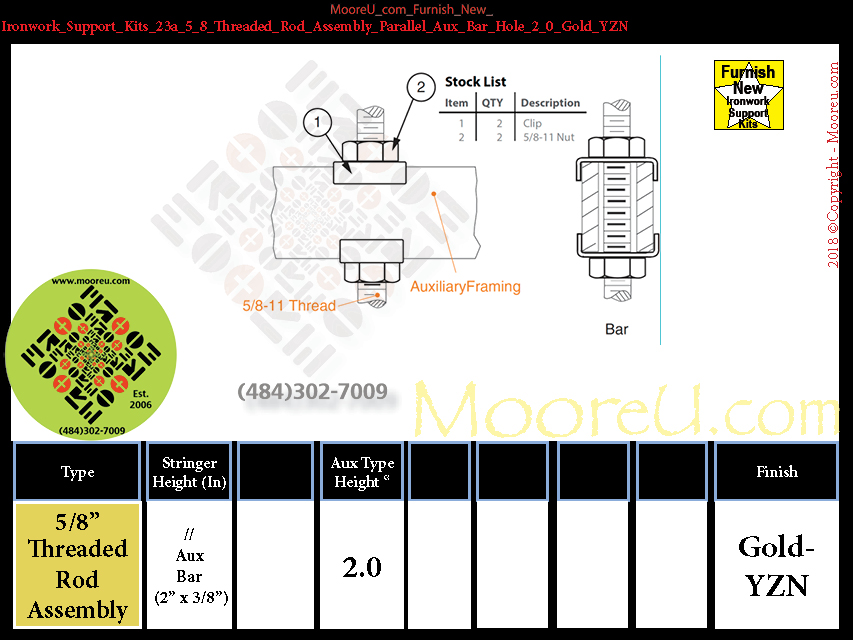 Ironwork Support Kits, Each_Kit, Color = Gold_YZN, Detail = 5_8_Threaded_Rod_Assembly, Hardware = 2_0, Type = Parallel_Aux_Channel, I1-1x5/8"-11 Hex Nut, I2-2xClip I3-2xInsulator, I4-0xna, I5-0xna, I6-0xna, I7-0xna, I8-0xna, I9-0xna
