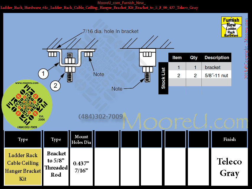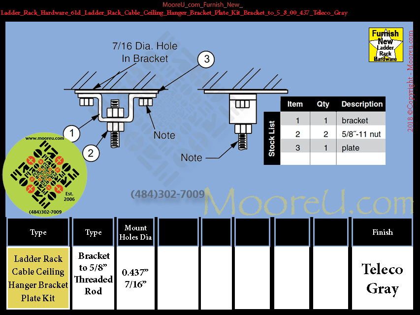 Ladder Rack Hardware, Each_Kit, Color = Teleco_Gray, Detail = Ladder_Rack_Cable_Supporting_Hanger, Hardware = 5/8", Type = Bracket_to_5, I1-2x5/8"-11 Hex Nut, I2-1xPlate I3-1xna, I4-0xna, I5-0xna, I6-0xna, I7-0xna, I8-0xna, I9-0xna