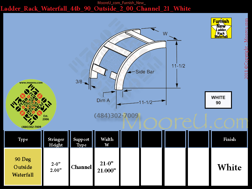 Ladder Rack Waterfall, Each, Color = White, Degree = 90, Bend Type = Outside, Stringer Construction = Channel, Stringer Height inch = 2", Width inch = 21, Waterfall Depth In = 11_50, Waterfall Height In = 11_50