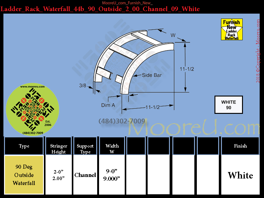 Ladder Rack Waterfall, Each, Color = White, Degree = 90, Bend Type = Outside, Stringer Construction = Channel, Stringer Height inch = 2", Width inch = 9, Waterfall Depth In = 11_50, Waterfall Height In = 11_50