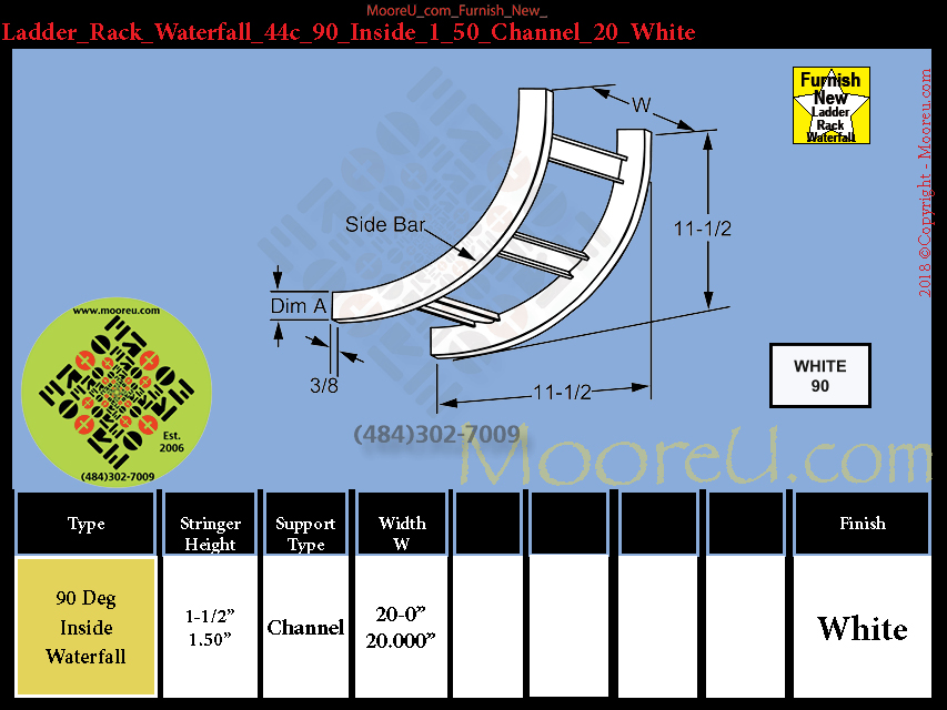Ladder Rack Waterfall, Each, Color = White, Degree = 90, Bend Type = Inside, Stringer Construction = Channel, Stringer Height inch = 1-1/2", Width inch = 20, Waterfall Depth In = 11_50, Waterfall Height In = 11_50