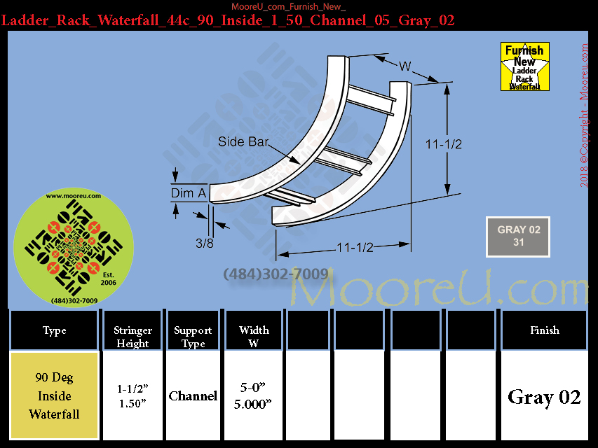 Ladder Rack Waterfall, Each, Color = Gray_02, Degree = 90, Bend Type = Inside, Stringer Construction = Channel, Stringer Height inch = 1-1/2", Width inch = 5, Waterfall Depth In = 11_50, Waterfall Height In = 11_50