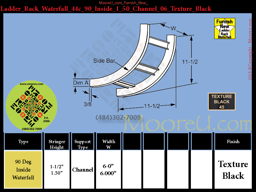 Ladder Rack Waterfall, Each, Color = Texture_Black, Degree = 90, Bend Type = Inside, Stringer Construction = Channel, Stringer Height inch = 1-1/2", Width inch = 6, Waterfall Depth In = 11_50, Waterfall Height In = 11_50
