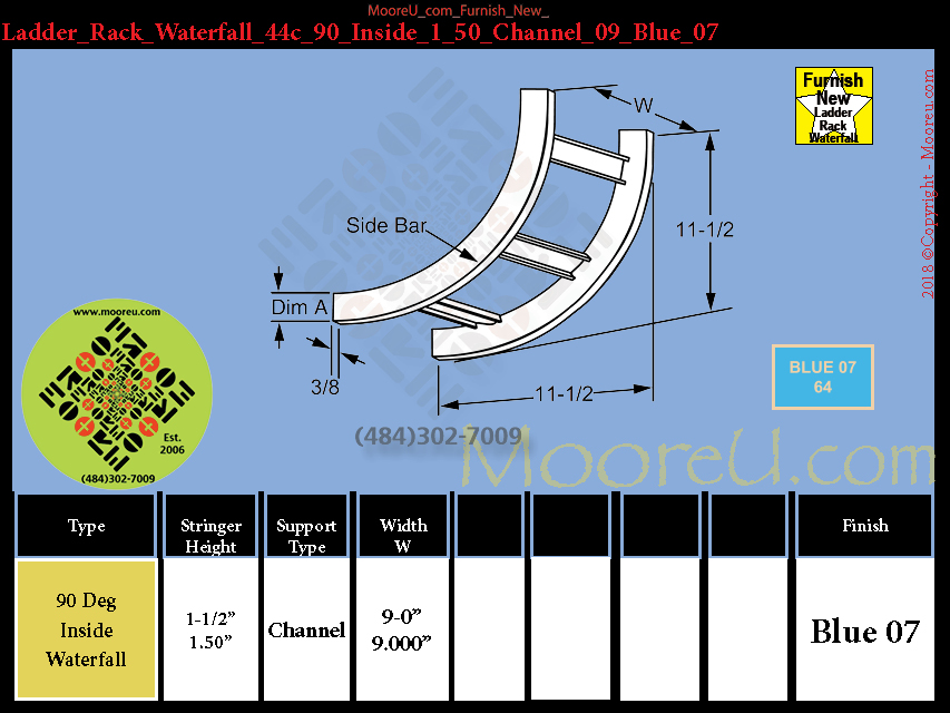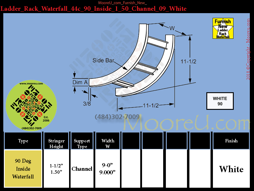 Ladder Rack Waterfall, Each, Color = White, Degree = 90, Bend Type = Inside, Stringer Construction = Channel, Stringer Height inch = 1-1/2", Width inch = 9, Waterfall Depth In = 11_50, Waterfall Height In = 11_50
