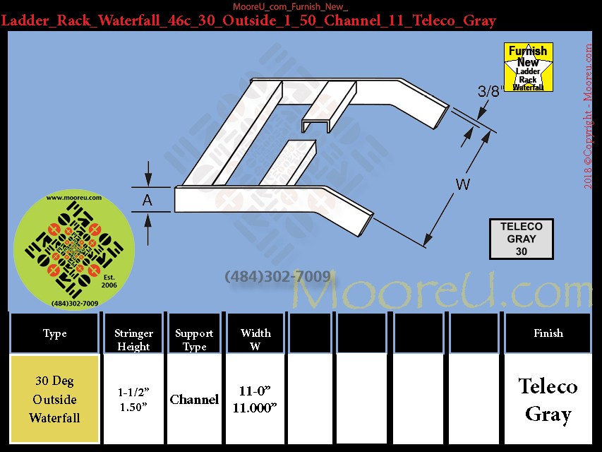 Ladder Rack Waterfall, Each, Color = Teleco_Gray, Degree = 30, Bend Type = Outside, Stringer Construction = Channel, Stringer Height inch = 1-1/2", Width inch = 11, Waterfall Depth In = 11_50, Waterfall Height In = 11_50