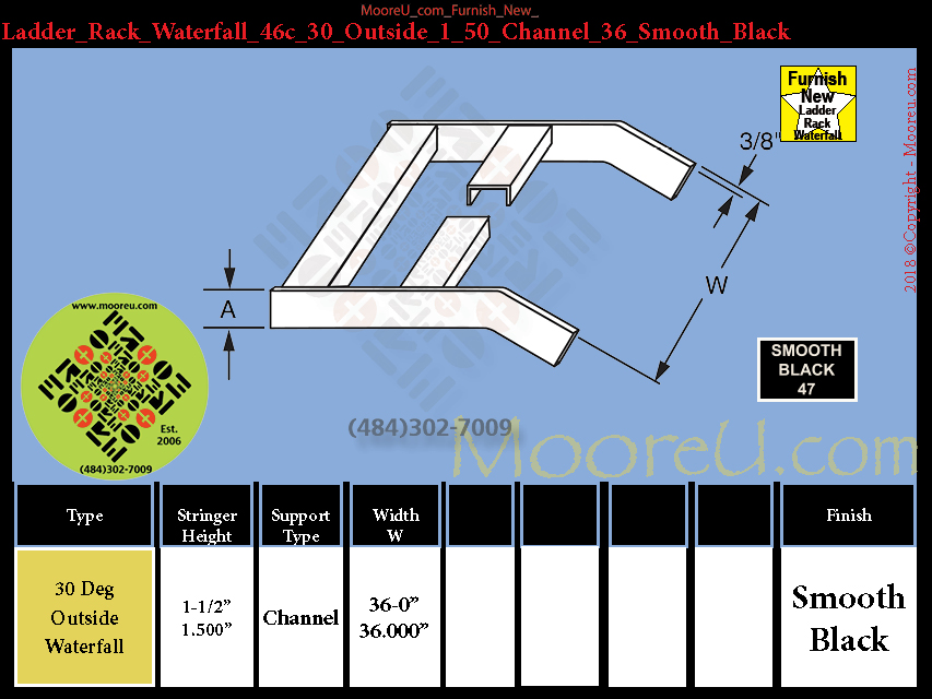 Ladder Rack Waterfall, Each, Color = Smooth_Black, Degree = 30, Bend Type = Outside, Stringer Construction = Channel, Stringer Height inch = 1-1/2", Width inch = 36, Waterfall Depth In = 11_50, Waterfall Height In = 11_50