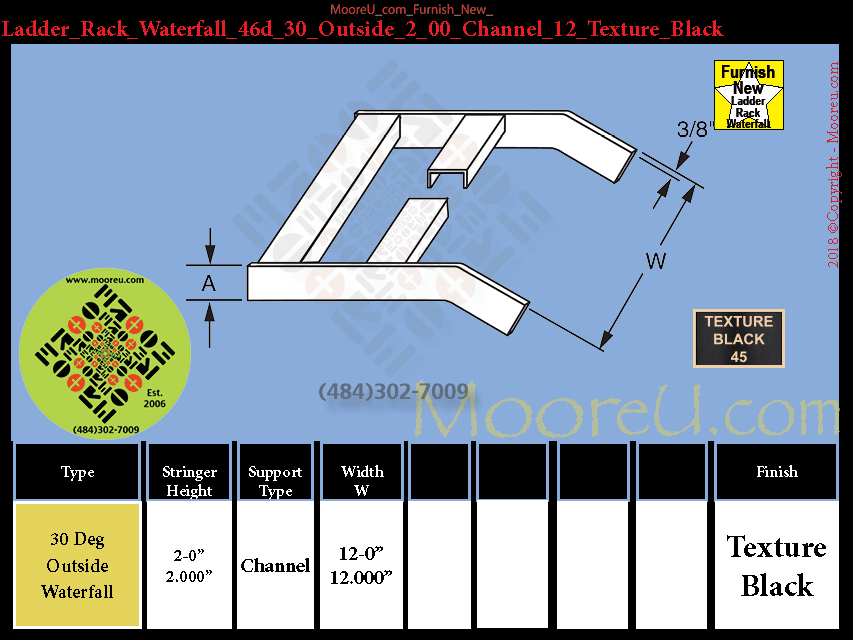 Ladder Rack Waterfall, Each, Color = Texture_Black, Degree = 30, Bend Type = Outside, Stringer Construction = Channel, Stringer Height inch = 2", Width inch = 12, Waterfall Depth In = 11_50, Waterfall Height In = 11_50