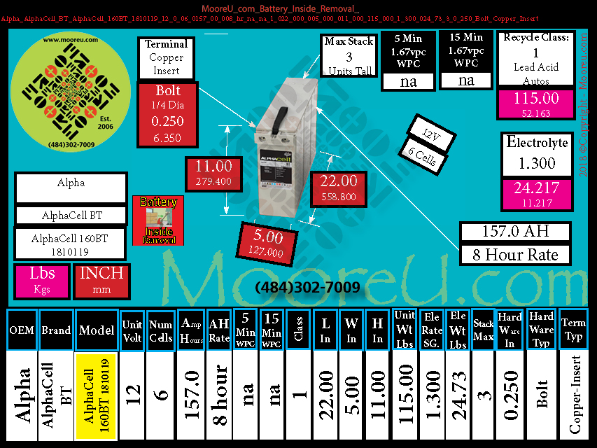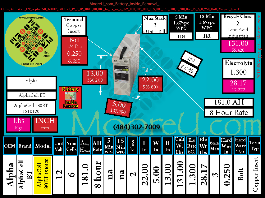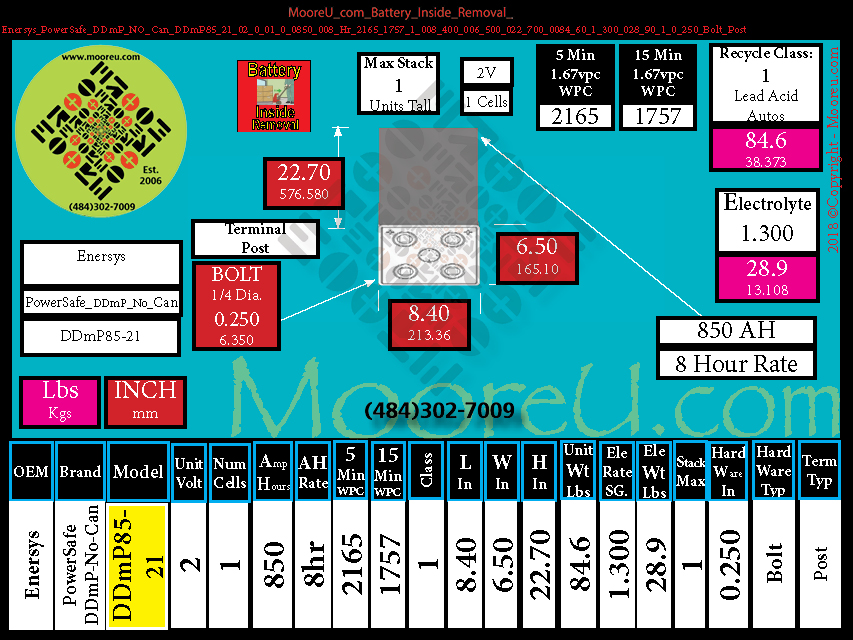 Each Unit , Enersys, PowerSafe_DDmP_NO_Can, DDmP85-21, VPU=02,CPU=01, AH=850-008_Hr, WPC-5min-1.67=2165, WPC-15min-1.67=1757, Class =Lead Acid Autos, Len. =8.4in, Wid. =6.5in, Hht. =22.7in, Wht. =84.6 lbs, Rating =1_300, E. Weight =28.9 lbs, Stack =1,Term. Hard. =1/4, Hard. Type =Bolt, Term. Type=Post